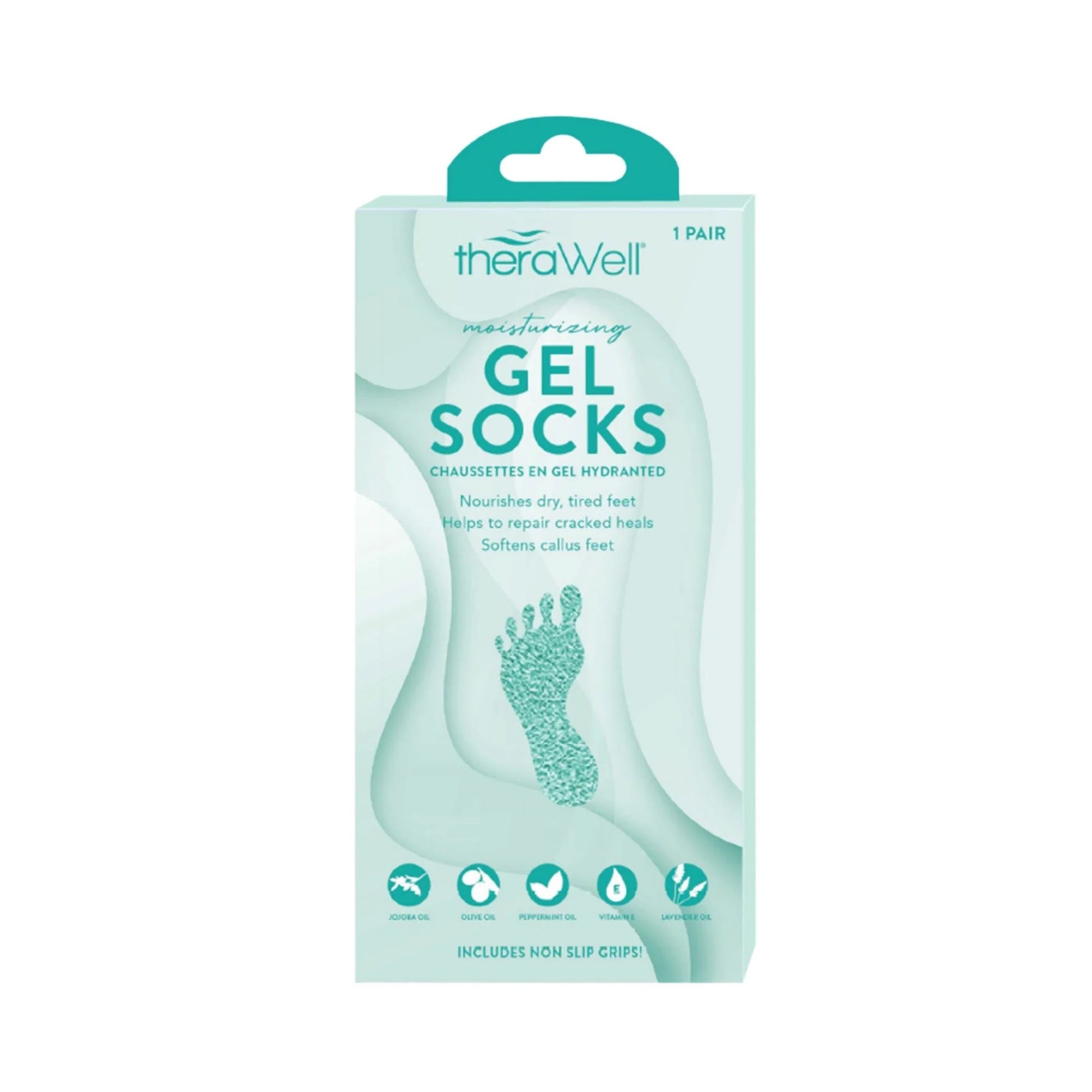 calcetines de gel hidratantes de la marca TheraWell. Estos calcetines están diseñados para tratar los pies secos con una terapia rica en humedad.