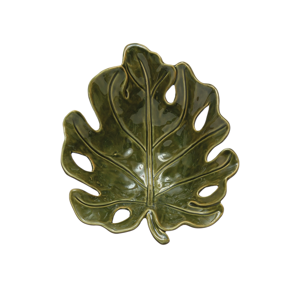 Platillo en forma de hoja de gres, esmalte reactivo.