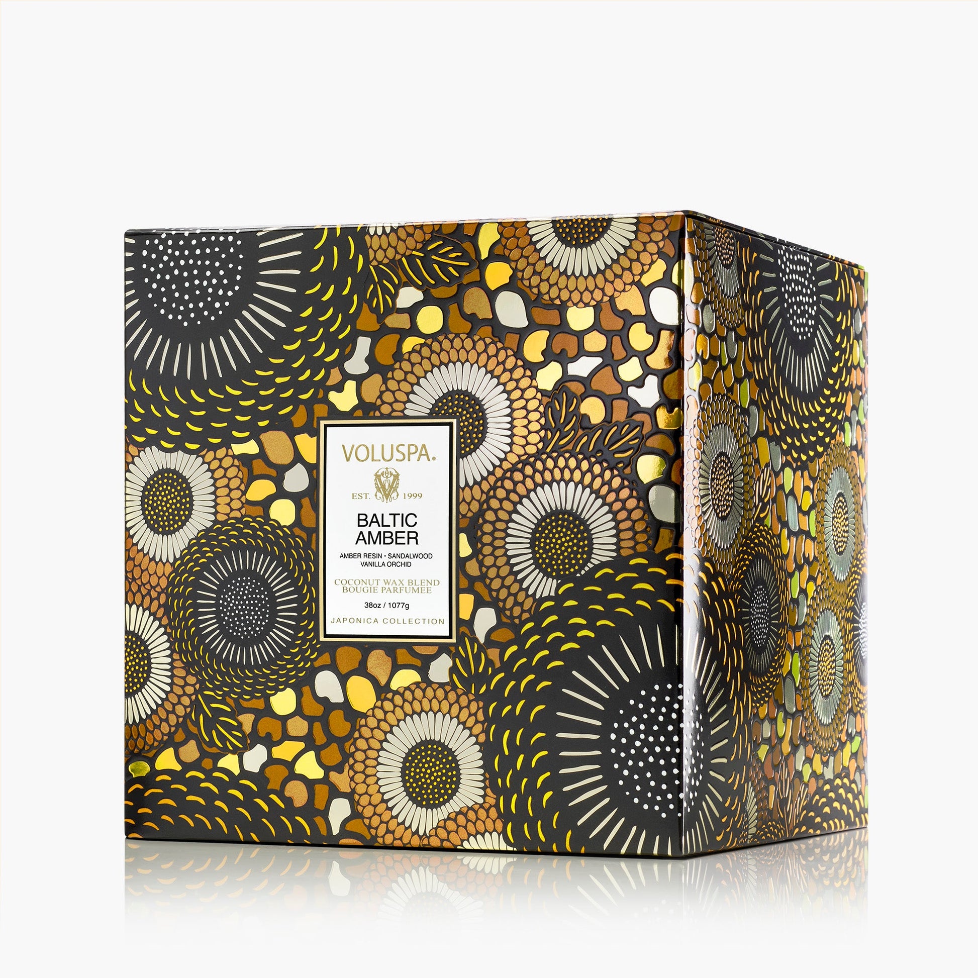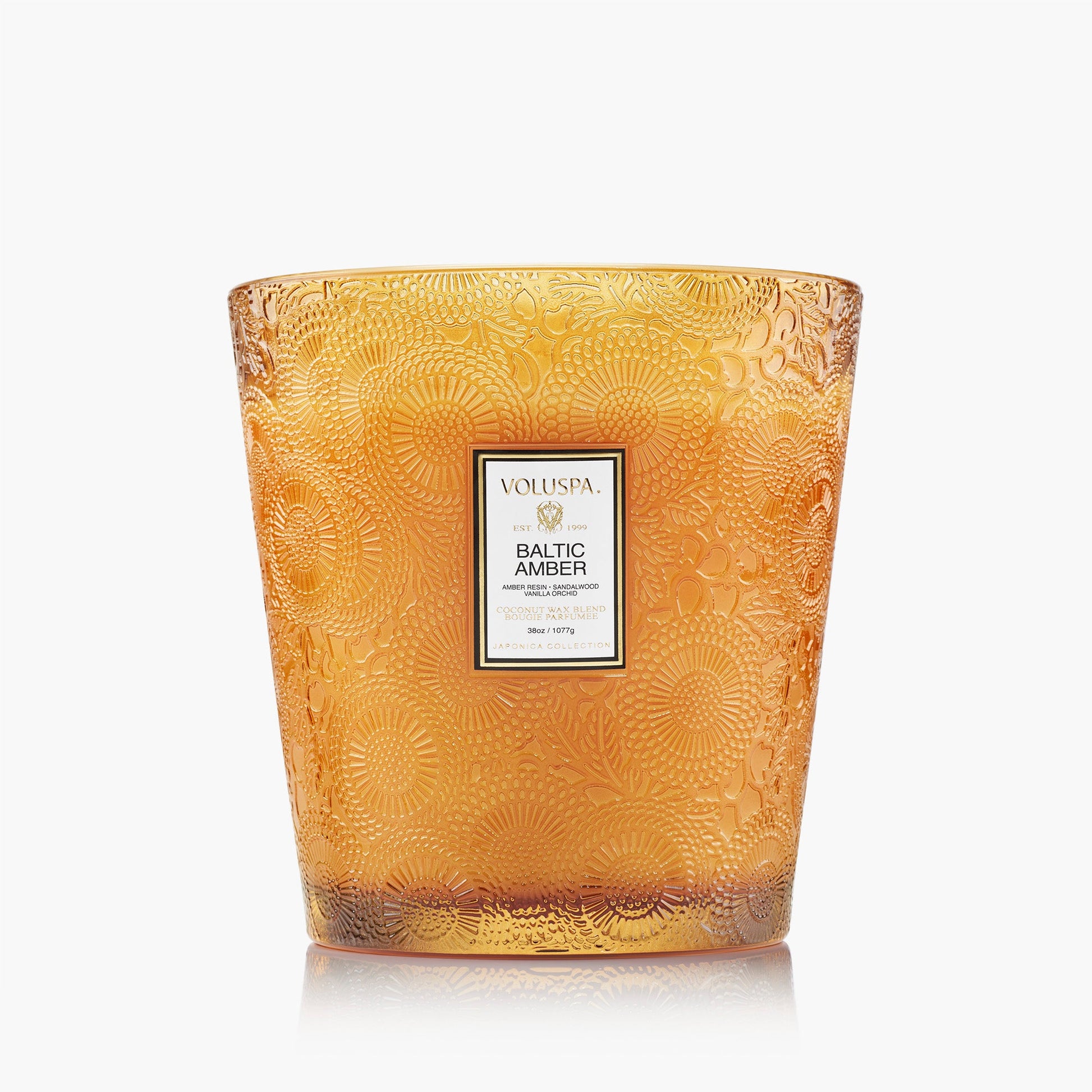 La exclusiva cera de coco de Voluspa se presenta en un frasco de vidrio grabado de 38 oz (1134 ml) con una elegante caja de regalo. Sus tres mechas permiten disfrutar de su fragancia durante 80 horas. Nuestras velas son elaboradas artesanalmente en EE. UU. con nuestra exclusiva cera de coco de alta calidad y mechas naturales. Nuestros productos no contienen ftalatos, parabenos ni sulfatos y no se testan en animales. Después de su uso, puedes reutilizar el recipiente como objeto decorativo.