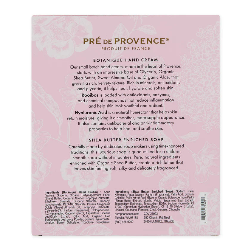 El Set de Regalo Pré de Provence Botanique incluye una crema de manos de Rooibos y Ácido Hialurónico y una pastilla de Jabón Heritage de Peonía de 150 g. Esta crema combina rooibos, rico en antioxidantes, para calmar y proteger, con ácido hialurónico que hidrata profundamente y mejora la textura de la piel. La pastilla de jabón, molida en Francia, produce una espuma rica y cremosa y está delicadamente perfumada con las suaves notas florales de la peonía. Elegantemente empaquetado y listo para exhibir, este set es ideal para regalar en temporada, para el spa o para el cuidado diario de la piel.