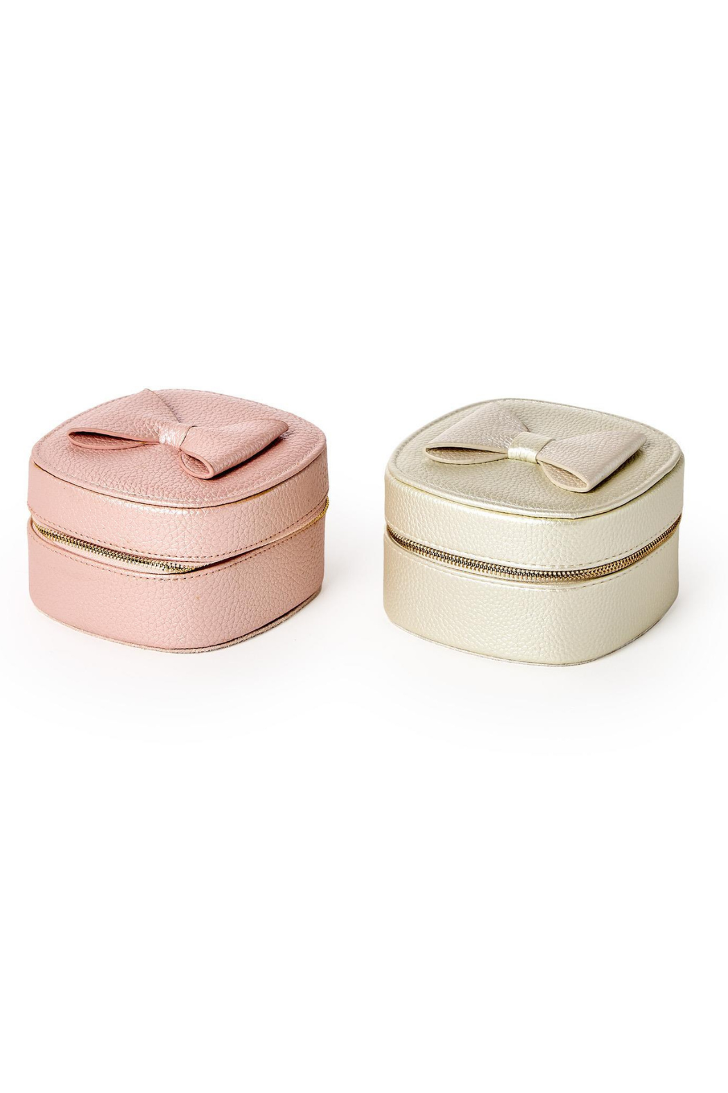 Diseñado con un encantador lazo en la parte superior, este elegante estuche cuenta con un cierre seguro con cremallera y compartimentos interiores cuidadosamente diseñados para mantener tus anillos, pendientes y collares en su sitio.