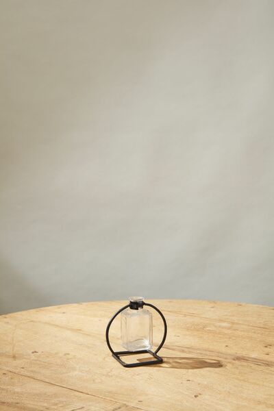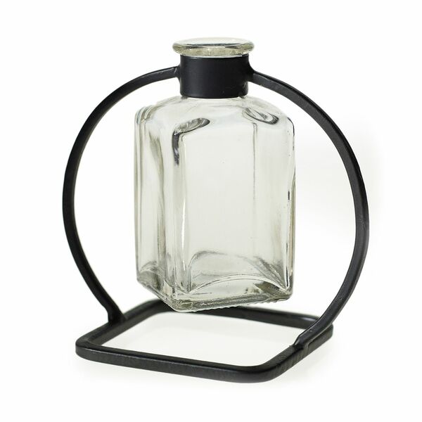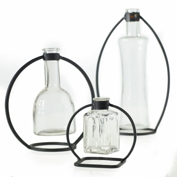 Este exclusivo jarrón presenta una botella de vidrio dentro de metal redondeado para una decoración completamente moderna.