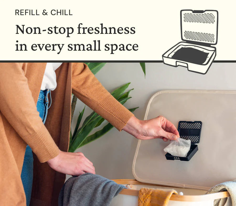 Grandes olores aparecen en espacios pequeños. Afortunadamente Fresh Wave Fresh Pods ir a cualquier parte. ¡Botes de basura, armarios, cubos de pañales, casilleros, barcos, vehículos recreativos y mucho más! Saque la caja rellenable de la bolsa de plástico y retire el respaldo adhesivo. Adhiera a una superficie limpia y plana*. ¡Esos pequeños olores espaciales se reducen a tamaño! Reemplace el paquete cada 30 días con paquetes de eliminación de olores de onda fresca.