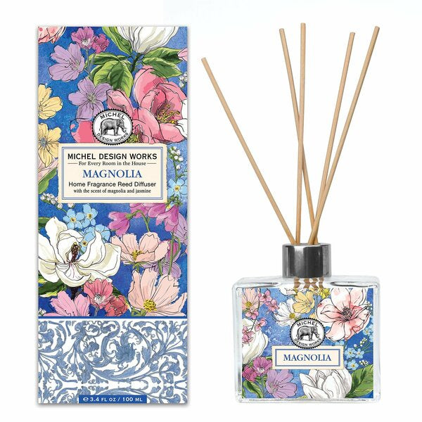 Las magnolias, celebradas en un diseño vibrante y pictómico, combinan su aroma dulce y suave con otras flores favoritas. Escondido de forma segura dentro de esta caja decorativa hay un elegante decantador de vidrio y un conjunto de ocho palitos de bamboo diseñados para dispersar suavemente la fragancia.