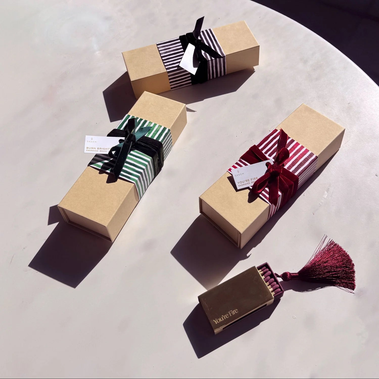 Grabado con un mensaje entrañable que despierta alegría a primera vista, nuestra Caja de Cerillas Merriment es un símbolo del glamour de la temporada. Su exterior de latón macizo proyecta un brillo cálido y festivo, mientras que una suave borla negra le aporta sofisticación y textura. En una elegante caja decorativa con funda dorada, disfruta de un regalo perfecto o decora tu mesa de centro como un tesoro llamativo.