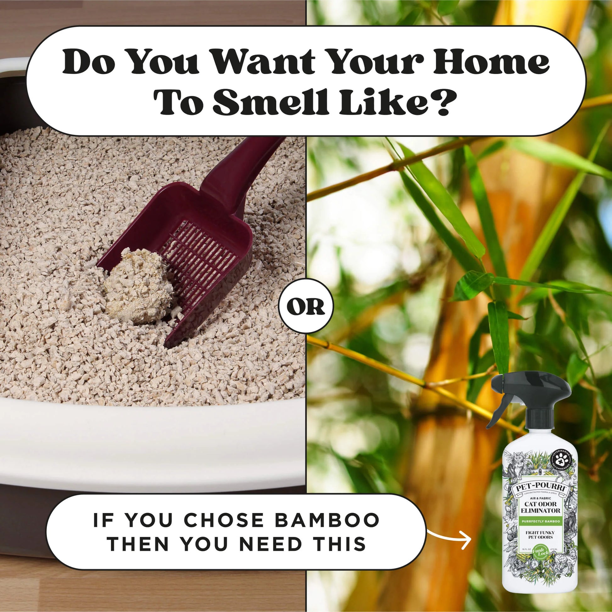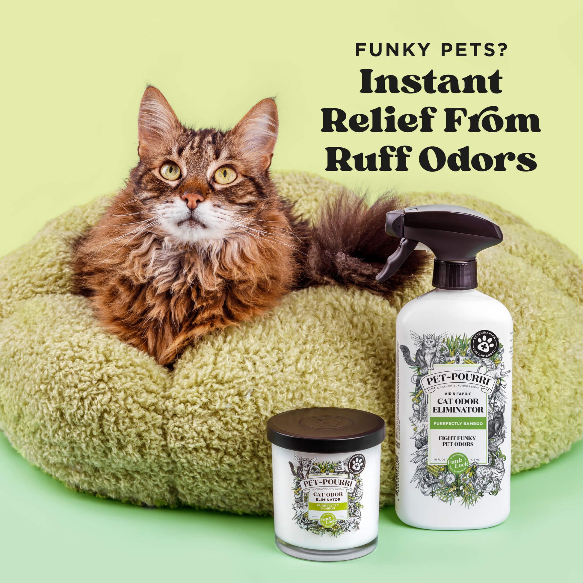 - Frescura instantánea, sin olores persistentes –Unas pocas pulverizaciones de Pourri Purrfectly Bamboo desodorizan instantáneamente los olores de gato, especialmente los olores fuertes de orina y orina de gato.