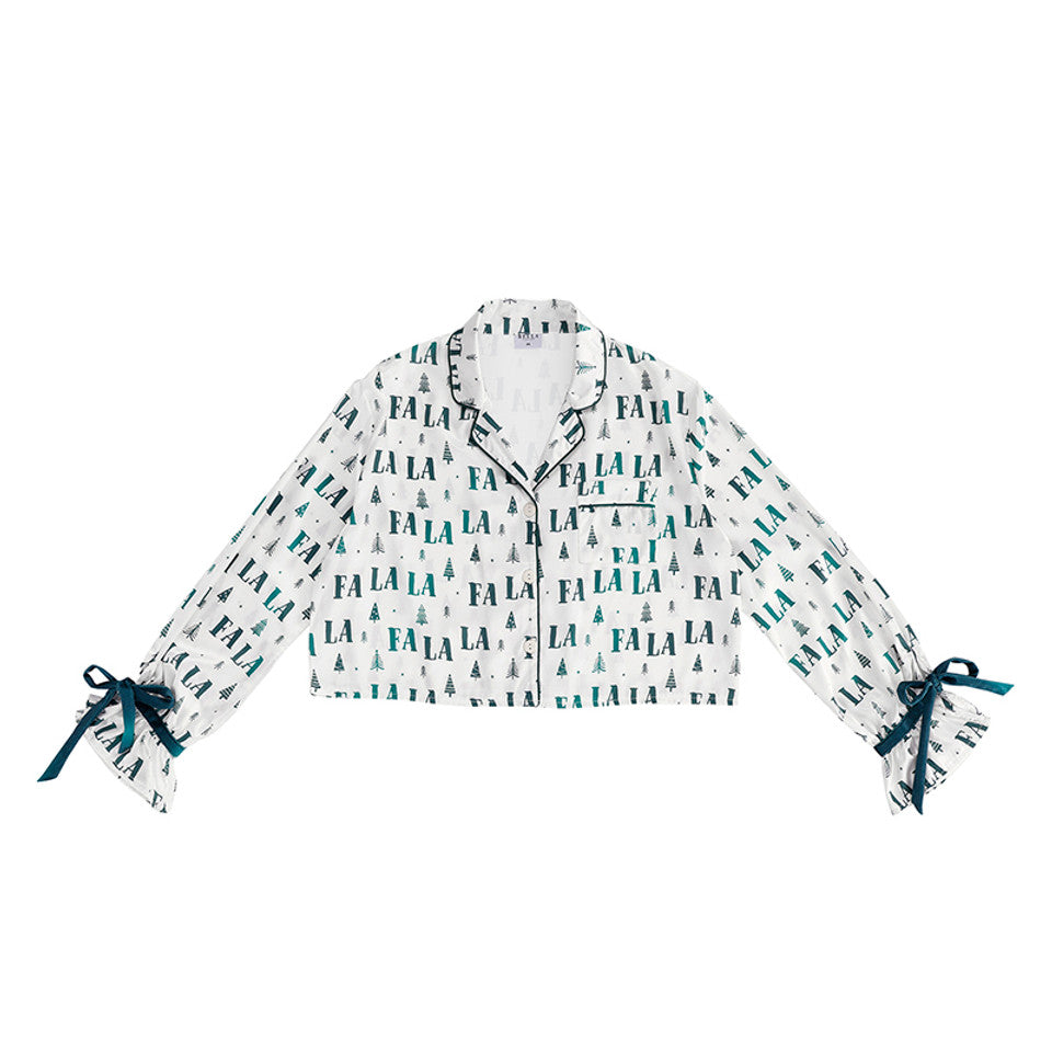 Conjunto de pijama con top corto con volantes y pantalón corto con volantes y lazos de terciopelo - Marfil y verde bosque FALALA