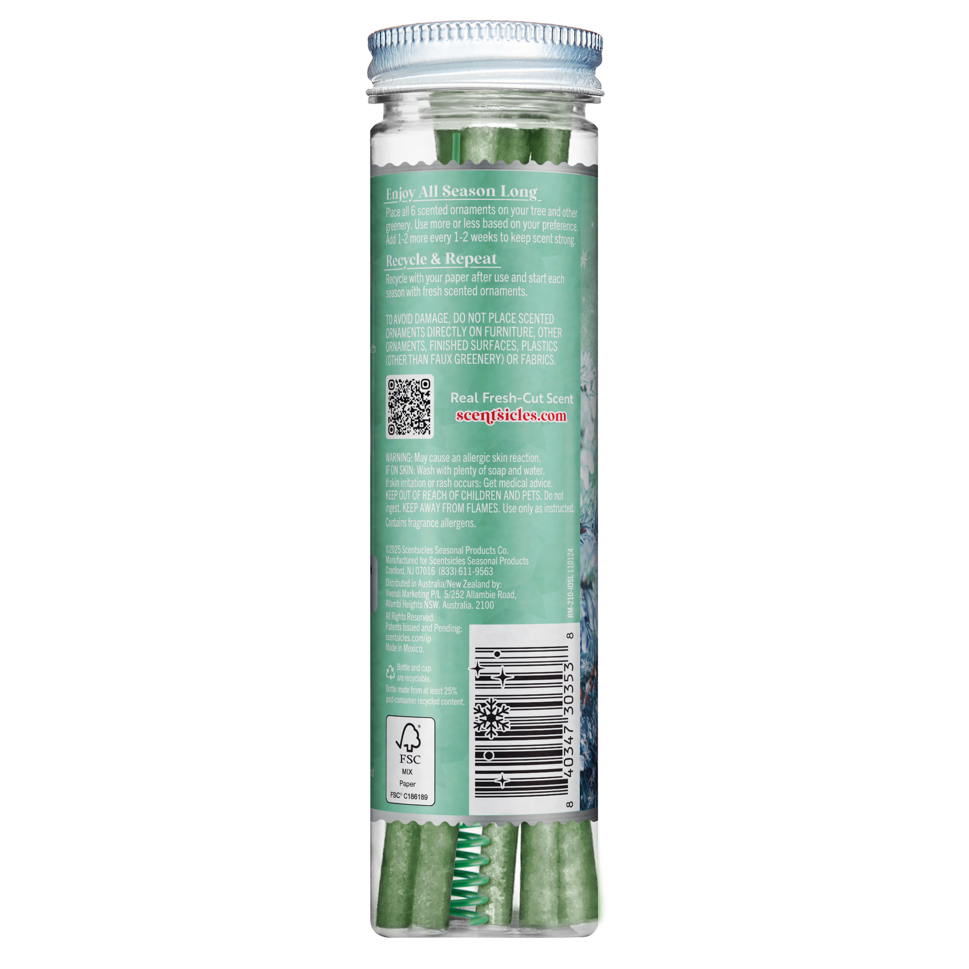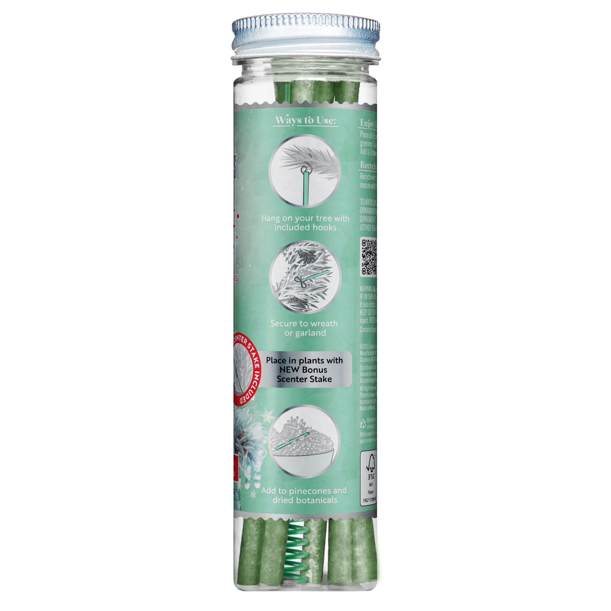Hecho de papel sostenible, biodegradable y reciclable con certificación FSC (envasado en una botella de PET reciclable con tapa de aluminio), coloreado en un pantone verde azulado claro con un tinte seguro de calidad alimentaria para combinar con la vegetación navideña y los árboles flocados.