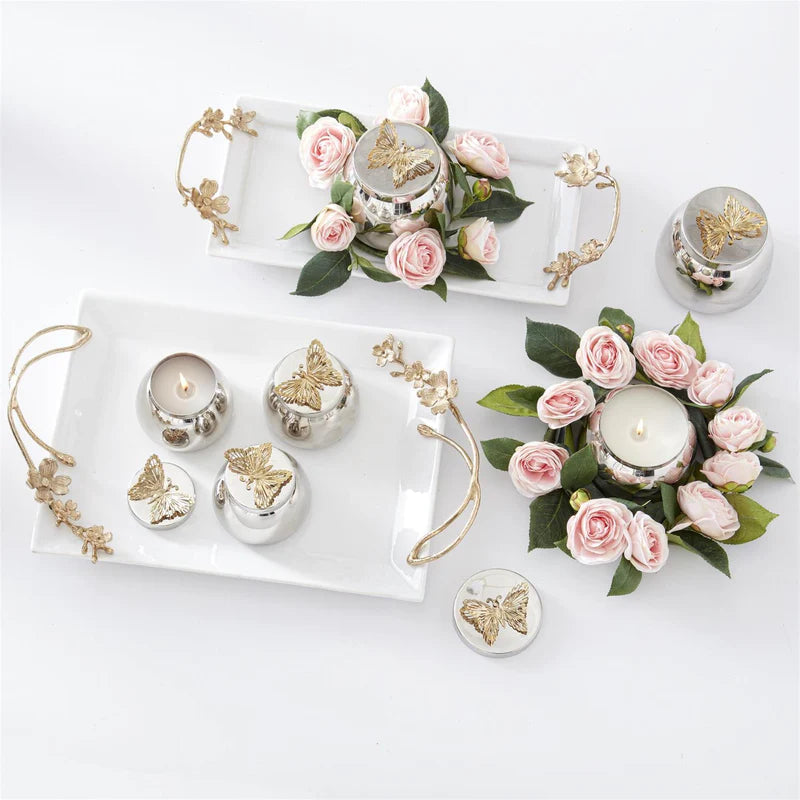 ealza el ambiente de tu hogar con los tarros surtidos de metal para velas, con encantadoras tapas de mariposa, en un set de tres. Elaborados con precisión y estilo, crean un atractivo visual cautivador que combina a la perfección modernidad con un toque de fantasía.