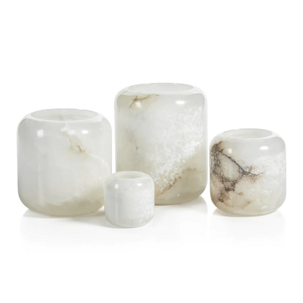 Fabricado en piedra de alabastro de primera calidad, este portavelas/florero luce un brillante acabado pulido que añade un toque de sofisticación a cualquier estancia.